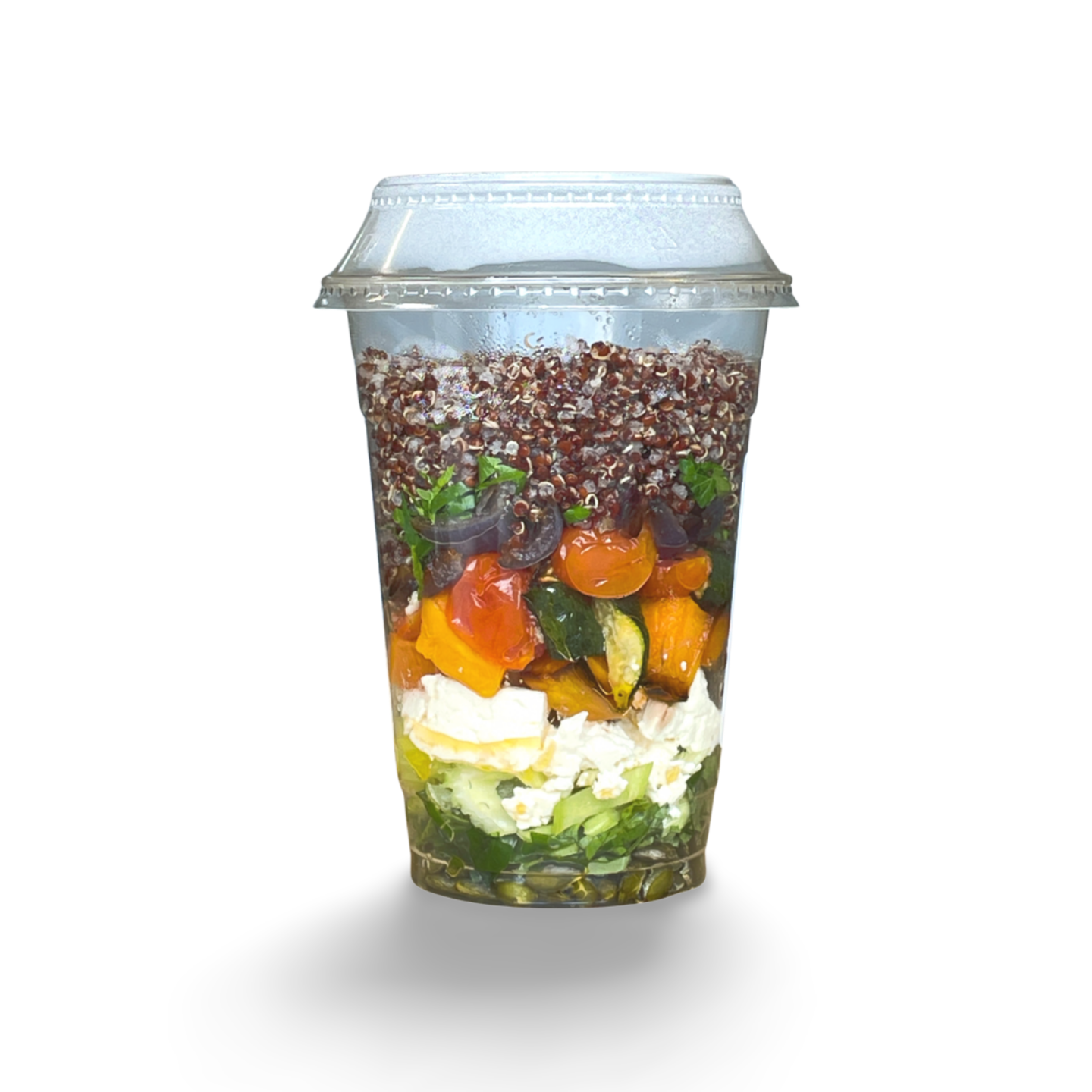 INGREDIENTS – Red quinoa, red onions, roasted tomatoes, courgettes, pumpkin, feta, celery, basil and pumpkin seeds. DRESSING: Extra virgin olive oil, balsamic vinegar, garlic, gluten free tamari, salt and pepper.